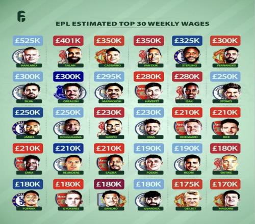 最近足球媒體發(fā)布一份《英超預計周薪Top30》榜單,哈蘭德、薩拉赫、范戴克等球員都在榜上。52.5萬鎊、40.1萬...