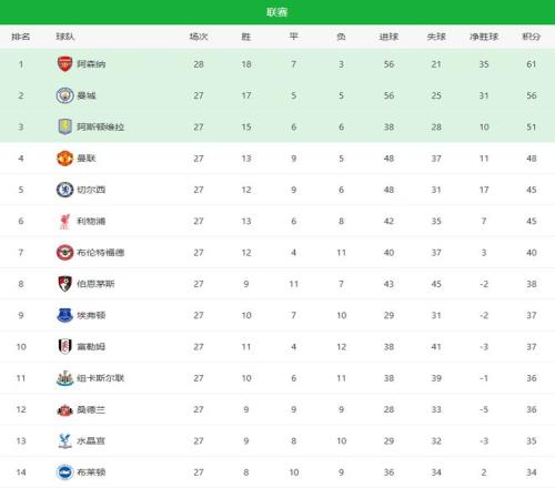 英超最新積分戰(zhàn)報(bào)阿森納大勝多曼城5分利物浦追上曼聯(lián)切爾西