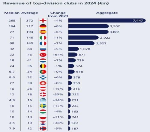 收入排名前20的聯(lián)賽中,有16個(gè)聯(lián)賽在2024年實(shí)現(xiàn)了收入增長(zhǎng)。英格蘭俱樂(lè)部繼續(xù)創(chuàng)造最多的收入,盡管其收入占比從27%下降到26%。德國(guó)俱樂(lè)部的收入中位數(shù)是西班牙、意大利或法國(guó)俱樂(lè)部的兩倍多。