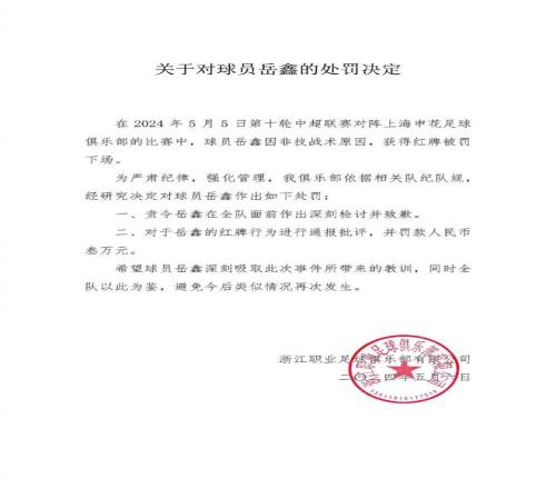 最近1次同樣發(fā)生在浙江隊(duì)身上,在2024年浙江隊(duì)與申花的比賽浙江隊(duì)岳鑫在裁判吹哨后一腳爆踢廣告牌,兩黃變一紅被罰下。俱樂(lè)部責(zé)令岳鑫在全隊(duì)面前作出深刻檢討并致歉,同時(shí)對(duì)岳鑫的紅牌行為進(jìn)行通報(bào)批評(píng)并罰款人民幣3萬(wàn)元。