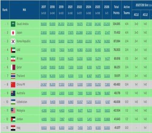 必須放開外援!中超亞足聯(lián)積分東亞第9:國足或被泰國超越