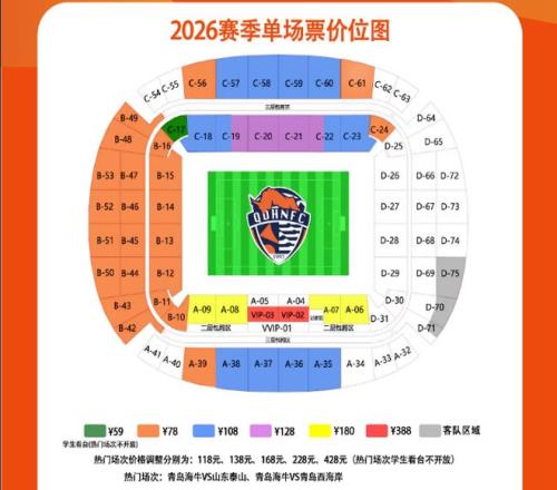相比較2025賽季,新賽季青島海牛主場散客的單場球票(2場熱門場次除外),從4個檔次細(xì)分為6個檔次,并且專門設(shè)置了學(xué)生看臺,票價為59元,設(shè)置在C17區(qū),C17區(qū)上賽季的票價為120元。在擁有專業(yè)足球場的中超球隊中,59元的球票確實(shí)不多見。